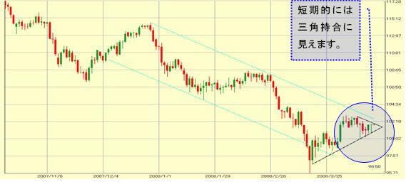 日足で見た場合、大きなトレンドは依然下方値バイアスがあるようですが 短期的には「三角保ち合い」を形成してきています。