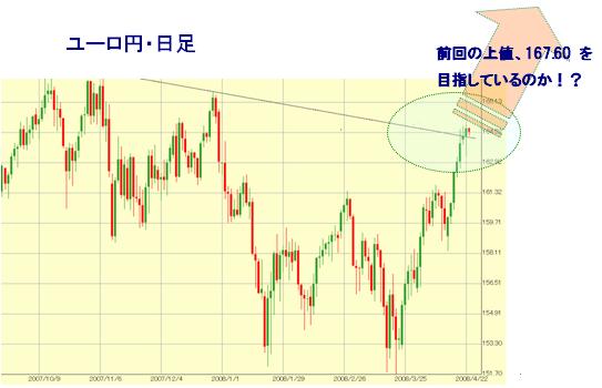 上記日足チャートでは、昨年11月に167円60銭をつけた後、一度も抜けていない 上値抵抗線を抜いてきています。