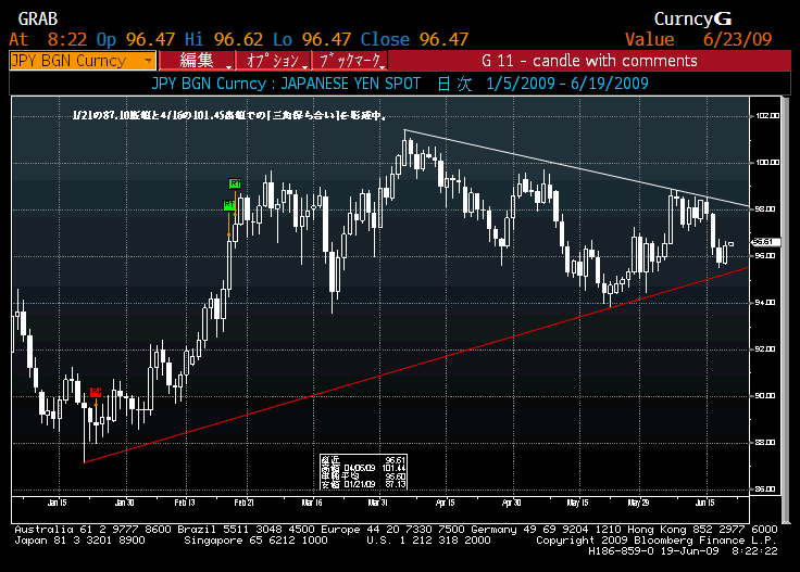 長い視点で観れば、今年のドル安値87円10と高値101円45の中での「三角保ちあい」