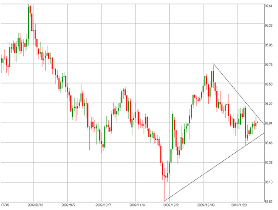 そのメドは89円と観ており、このレベルを割り込むと「下抜け」が確認され、