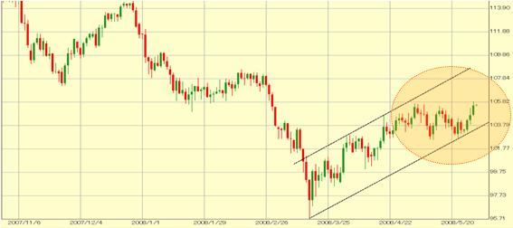- 原油が大幅に下げたことで、5/2の戻り高値105円70を抜き この日の高値105円88を示現しました。