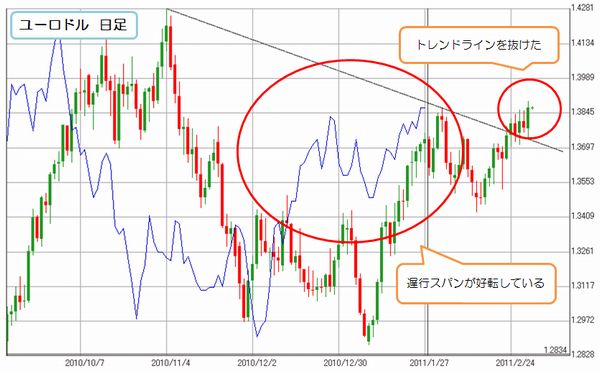 ユーロドルは前日にトレンドラインを上抜けし、上昇の気配を見せていました。