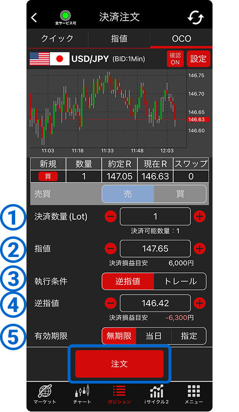 「決済注文」画面に移り、注文種類で「OCO」を選択し、各注文内容を設定します。最後に「注文」を選択します。