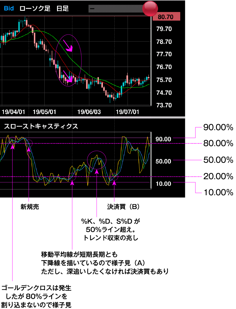次の例は豪ドル/円日足チャートになります。こちらも下げ局面でのエントリーになります。チャート左の最後の上昇局面で%DとS%Dのデッドクロスが発生していますが、80%ラインを割らなかったので、次のデッドクロスの発生後、80%ラインを割り込んだところで新規の売注文を入れます。ローソクチャート上に表示させた移動平均線(短期線=10・長期線=20)のデッドクロスよりも早く反応が出ています。